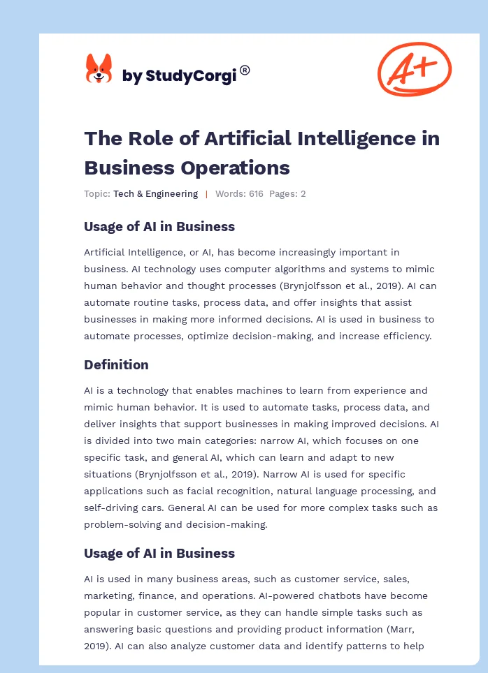 Artificial Intelligence, or AI, has become increasingly important in business. AI technology uses computer algorithms and systems to mimic human behavior and thought processes (Brynjolfsson et al., 2019). AI can automate routine tasks, process data, and offer insights that assist businesses in making more informed decisions. AI is used in business to automate processes, optimize decision-making, and increase efficiency.