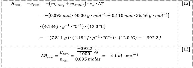 From the reaction of [2] stoichiometrically, the number of sodium hydroxide and hydrochloric acid moles should be equal. Considering the results from [10] and [11], it can be seen that NaOH is the limiting reactant, and hence, this number of moles should be used in the enthalpy change calculation. Then, using the formula [3], it was possible to determine the heat of the reaction [12] and enthalpy of the reaction [13]: