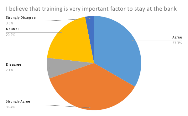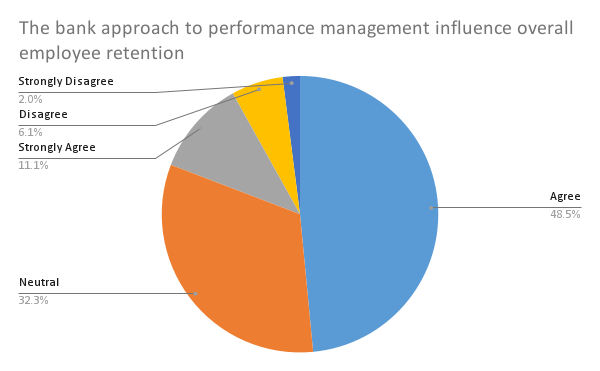 The final question relates to the Bank’s approach to performance management as a tool for retention improvement. More than half of respondents agree with this statement (48.5% agree and 11.1% strongly agree), while 32.3% feel neutral, and the minority disagrees (6.1% disagree and 2% strongly disagree).