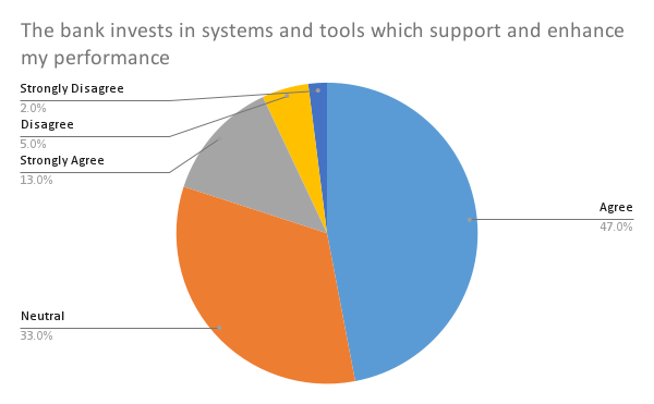 This question aimed to find out whether employees feel that the Bank promotes their performance through investing in systems and tools. Most of the employees agree with the statement (47% agree and 13% strongly agree), while 33% remain neutral, and the rest believe that there is no such investment.