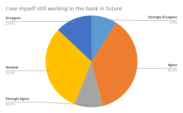 The final question in the demographics section concerns the number of years one has worked in the Bank. An equal percentage of people reported working for 1-3 years and seven or more years (31.3% in both cases). 20.2% of respondents have been employed at the Bank for less than a year, while 17.2% have worked for 4-6 years. These data indicate that retention strategies should be reviewed since there is a likelihood of people leaving after three years of work.